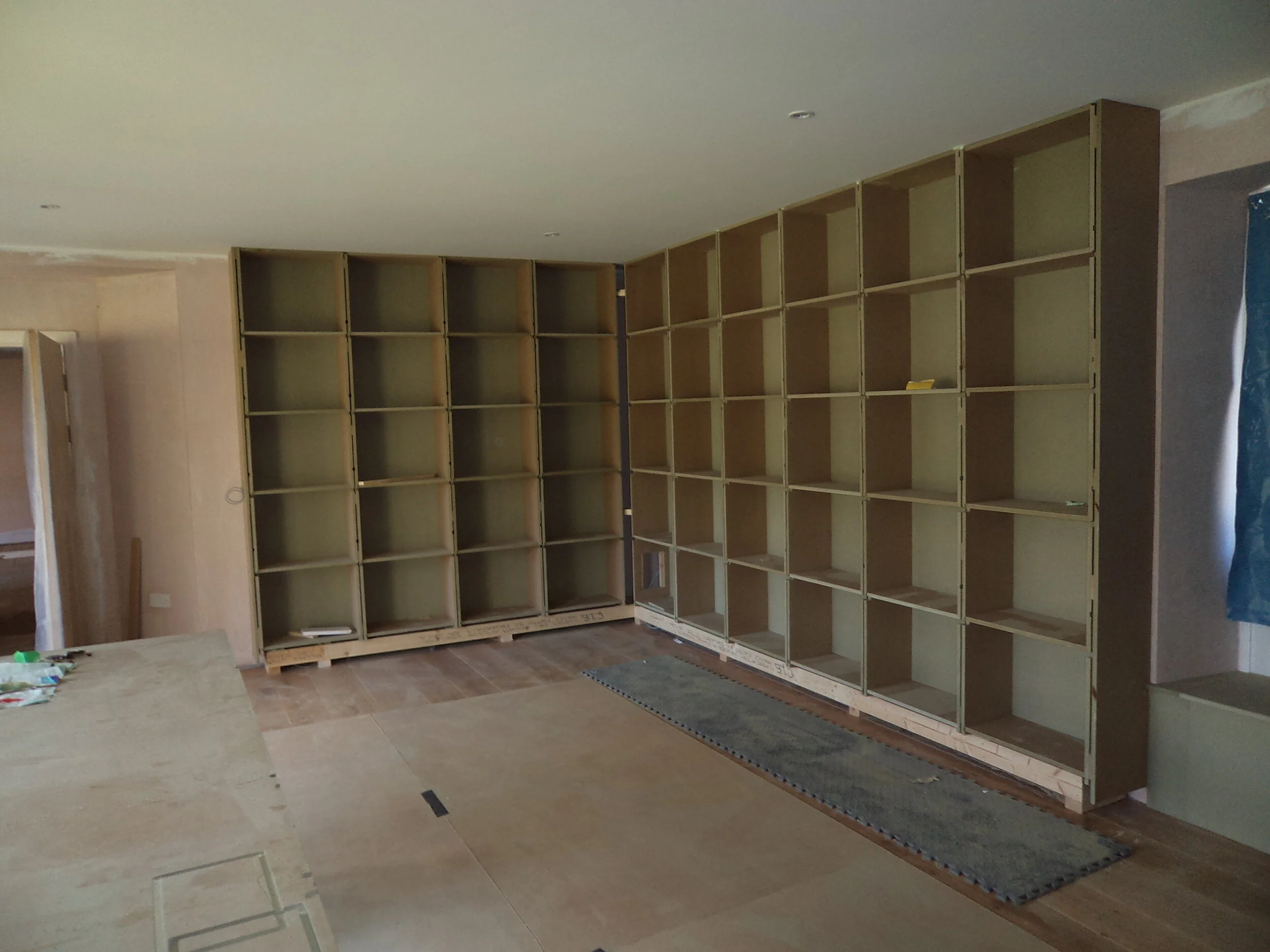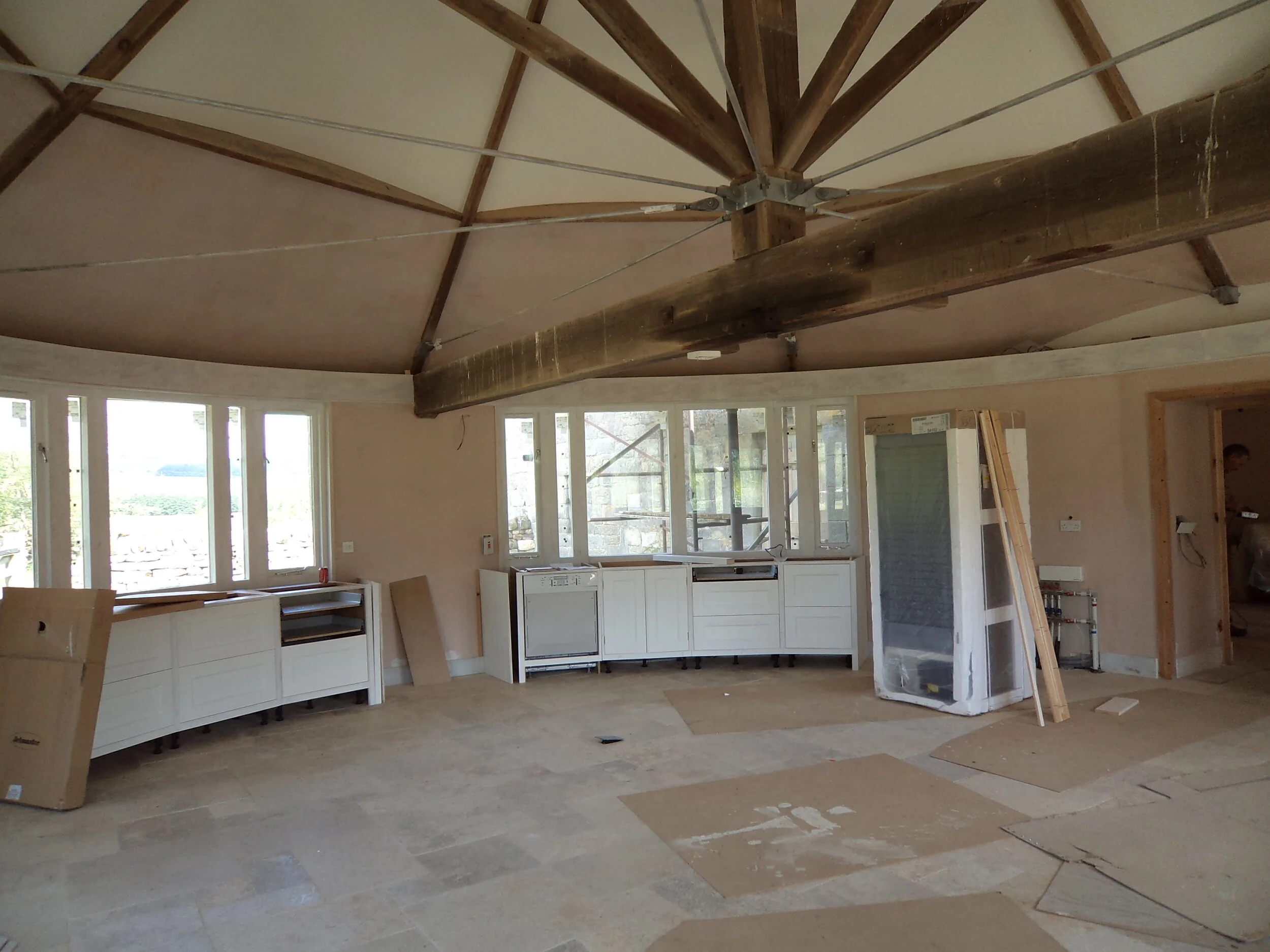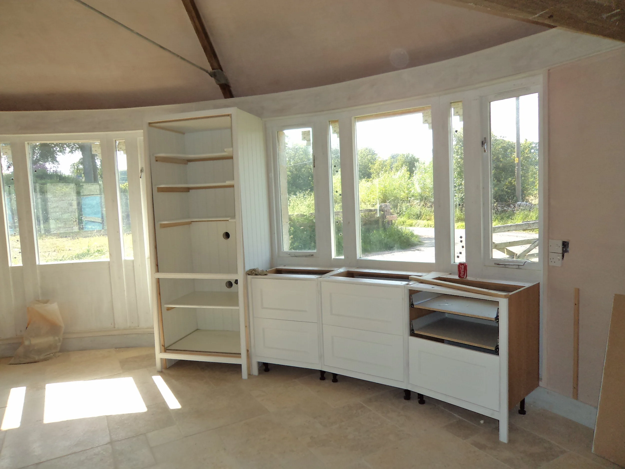 This client downsized to this barn conversion. She was keen to incorporate a more modern feel while keeping her pictures and furniture. We made a library that had a linear look to it with very elegant lighting, and the kitchen was put in the gin gan (a circular building where once grain was milled). This meant that the kitchen units had to appear to be curved, if we had cupboards made with curved fronts it would have been prohibitively expensive. The solution to this was to make the top curved and each cupboard angled to its neighbour. I also made an insulated larder cupboard, this has a manual sailing vent exiting to the north, slate shelves and double glazing to keep everything inside cool.