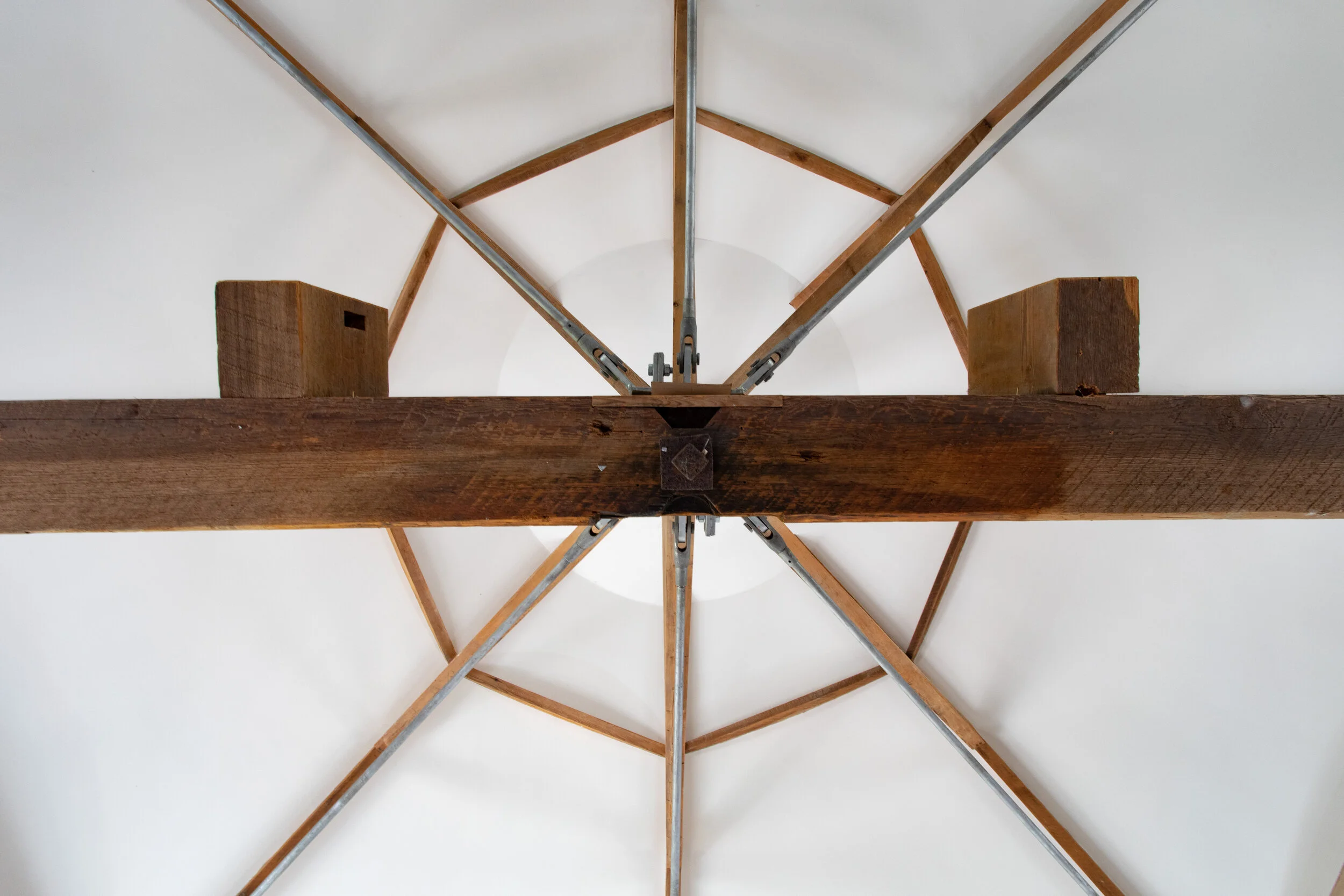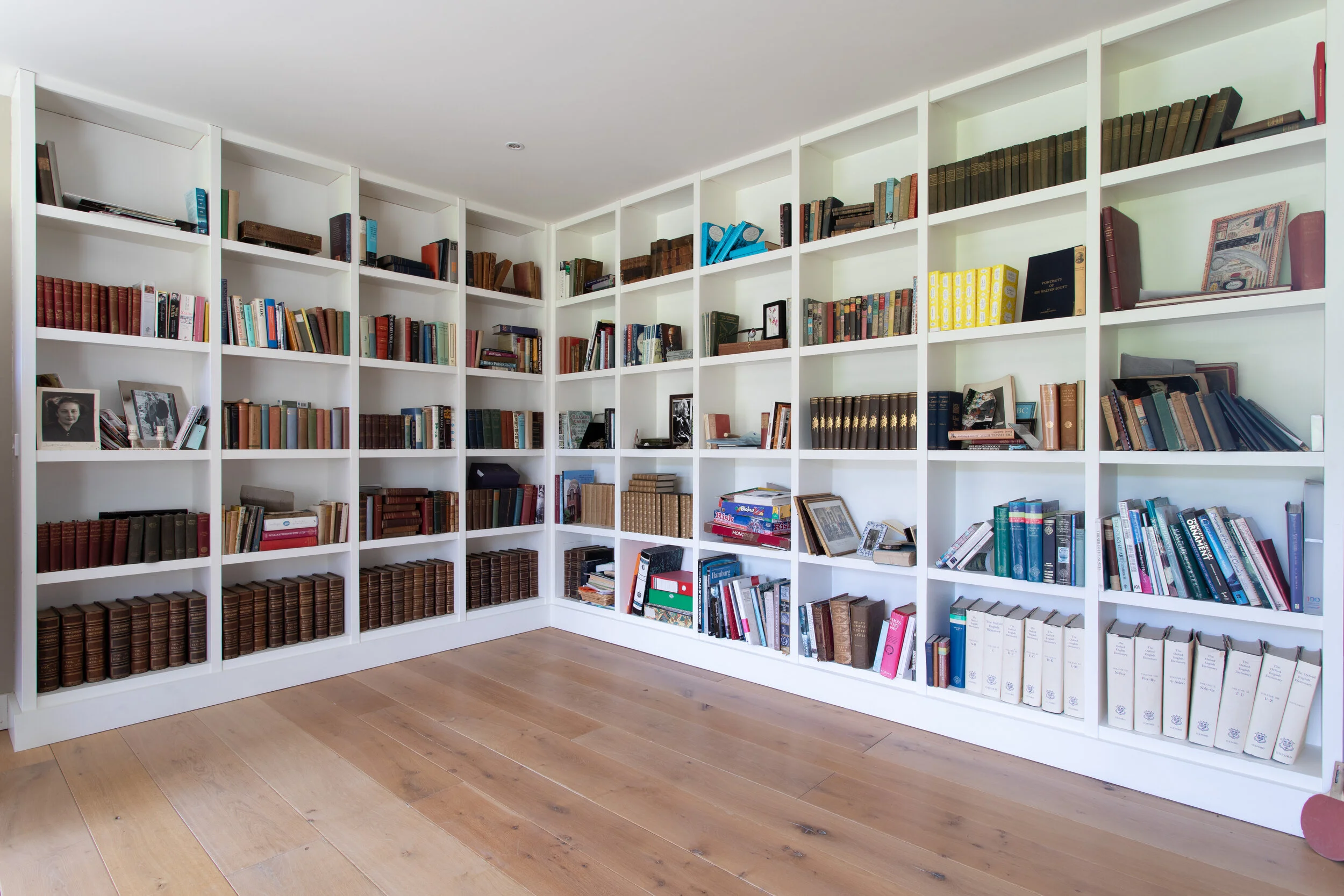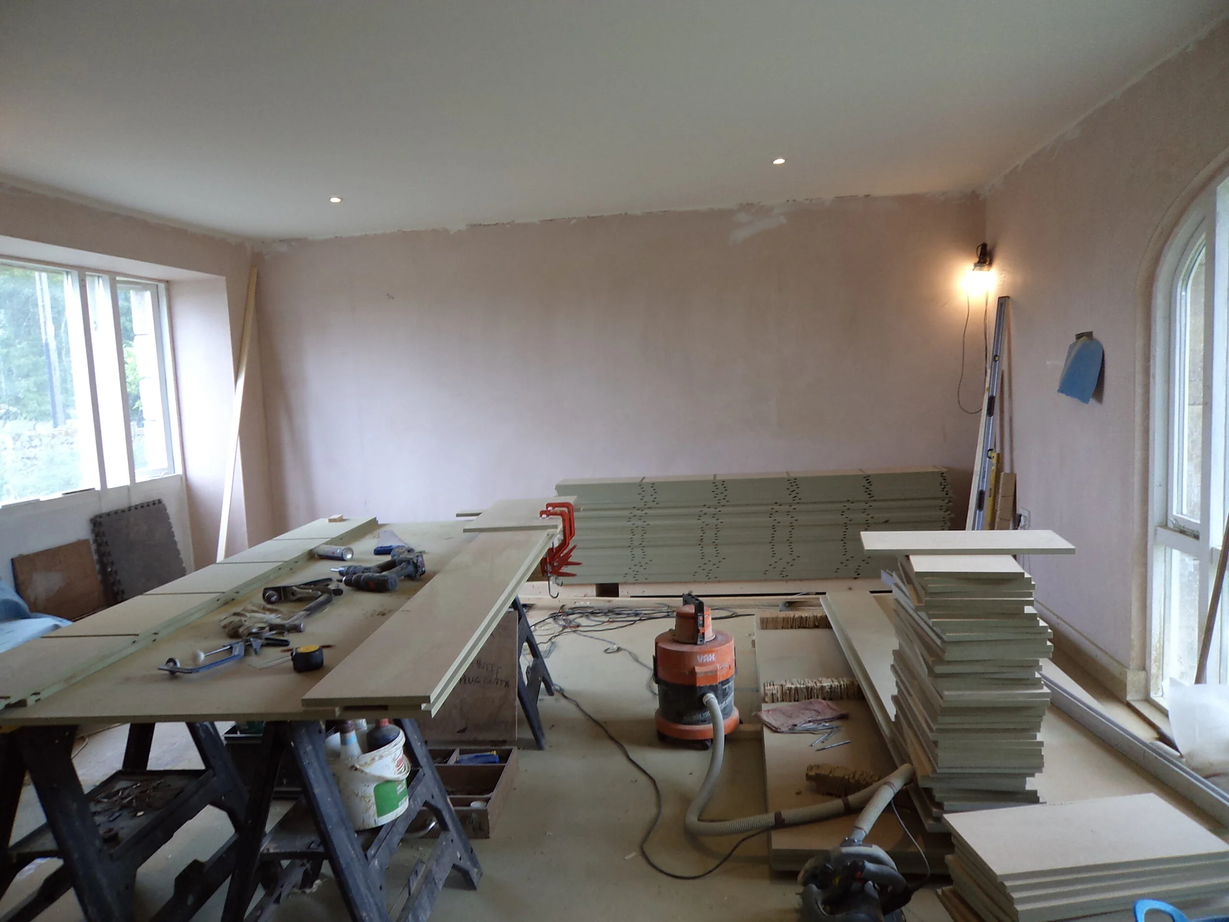 This client downsized to this barn conversion. She was keen to incorporate a more modern feel while keeping her pictures and furniture. We made a library that had a linear look to it with very elegant lighting, and the kitchen was put in the gin gan (a circular building where once grain was milled). This meant that the kitchen units had to appear to be curved, if we had cupboards made with curved fronts it would have been prohibitively expensive. The solution to this was to make the top curved and each cupboard angled to its neighbour. I also made an insulated larder cupboard, this has a manual sailing vent exiting to the north, slate shelves and double glazing to keep everything inside cool.