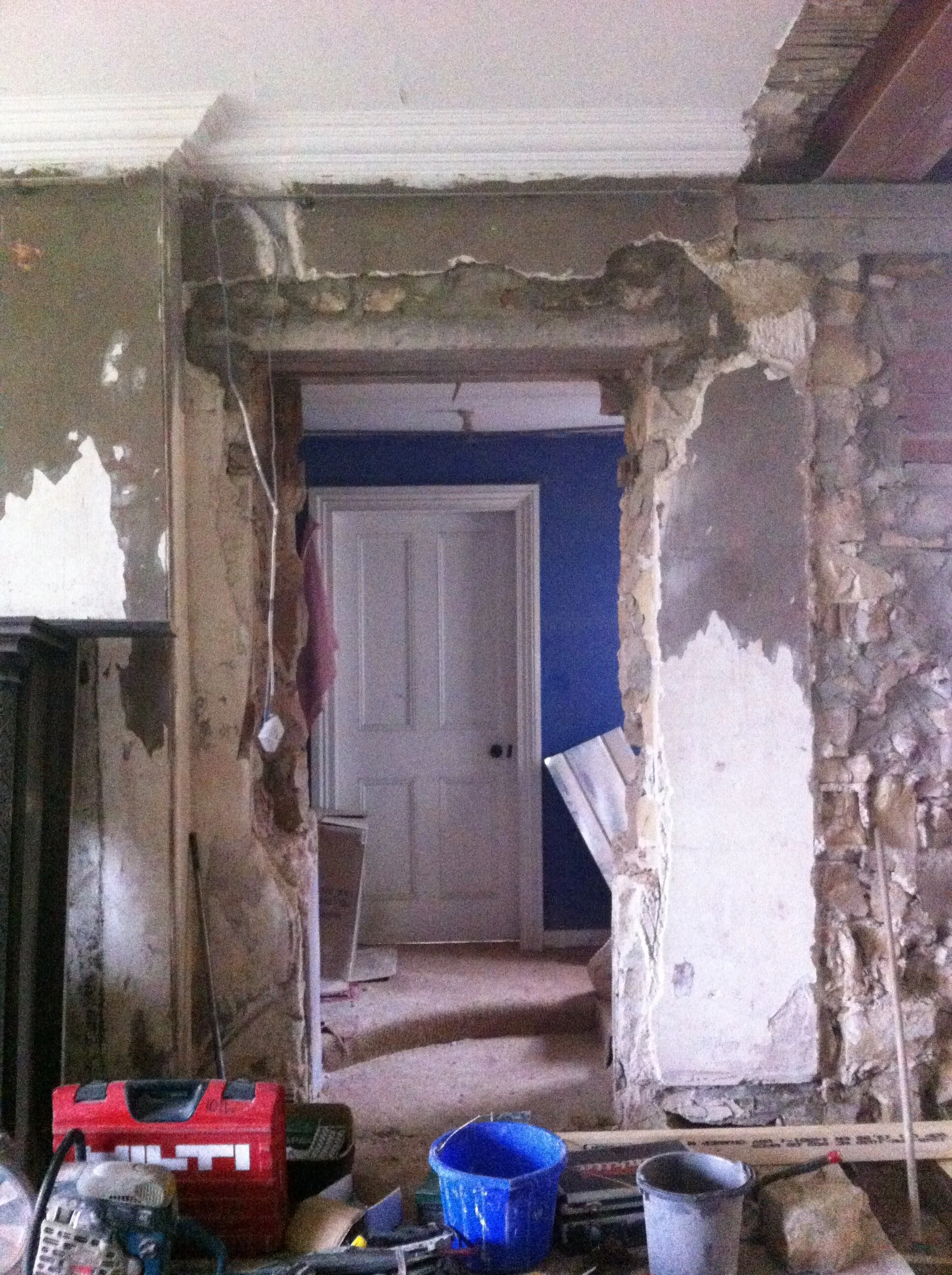 Three areas had to be dealt with more radically, we moved the kitchen from the back of the house to the dining room, we opened up the middle staircase letting in more light and creating a landing, and finally we got rid of the old sheds in the back yard and created a small glass house. We also made an archway using old quoins through the middle so you could see to the view beyond.